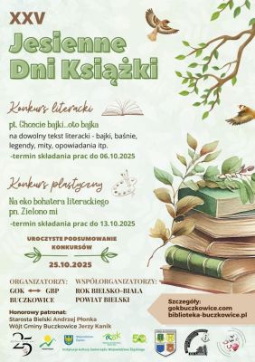 Gminny Ośrodek Kultury w Buczkowicach wspólnie z Gminną Biblioteką Publiczną w Buczkowicach wraz z filiami zapraszają do udziału w Wojewódzkim Konkursie Plastycznym na Eko bohatera literackiego pn. „Zielono mi” organizowanego w ramach przedsięwzięcia XXV Jesienne Dni Książki Buczkowice 2025.