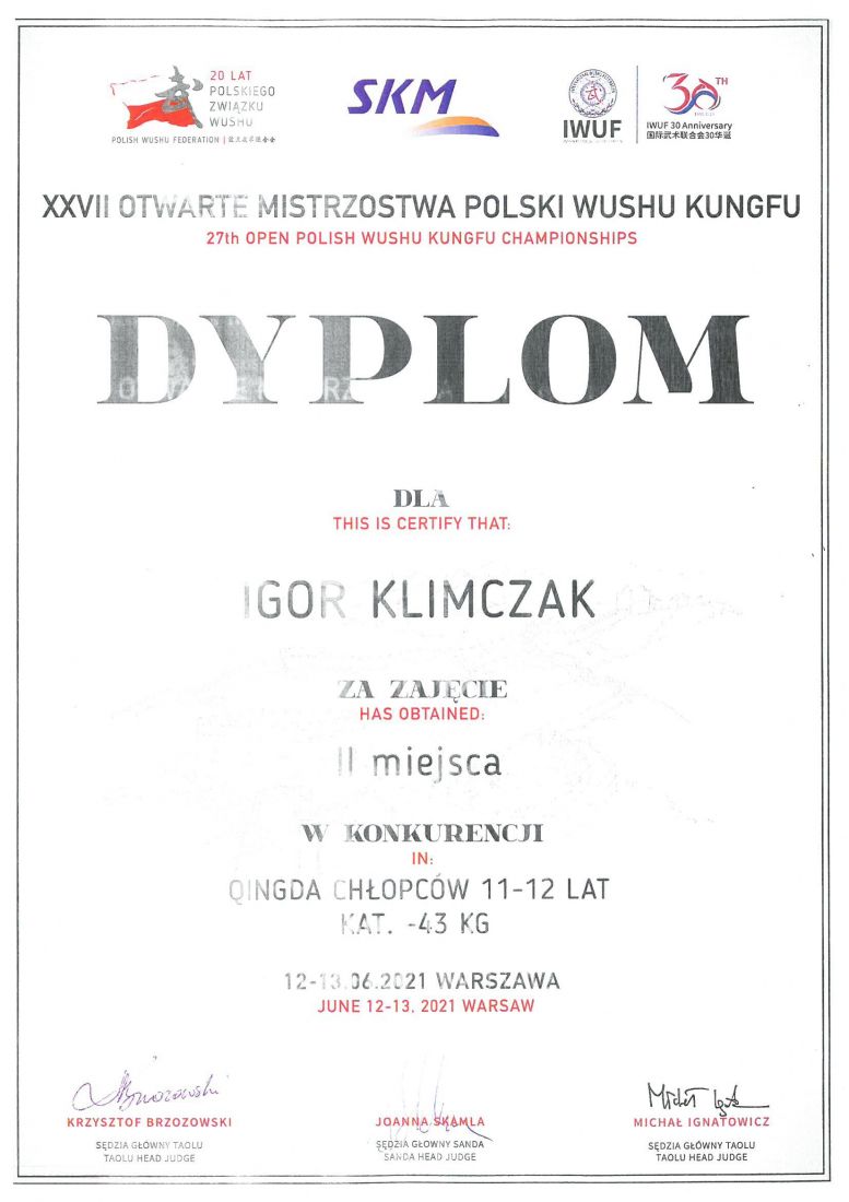 • QINGDA - kategoria wagowa do 43 kg - tytuł Wicemistrza Polski (srebrny medal),
