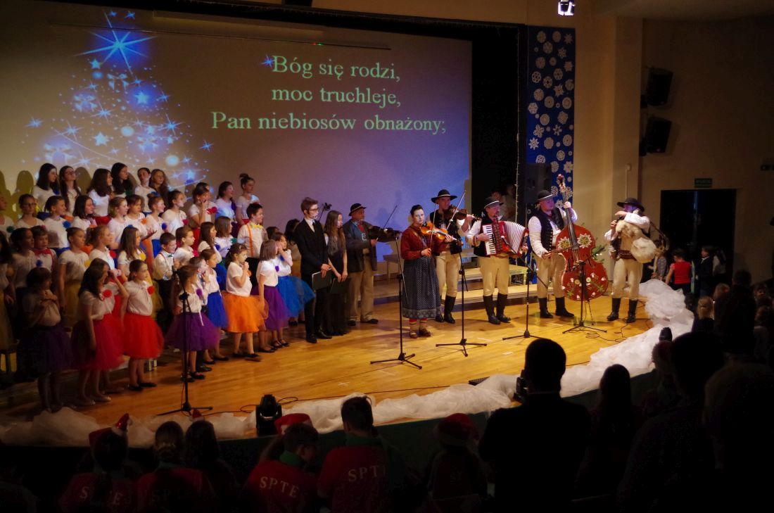 Tradycją naszego Dwójkowego kolędowania jest to, że śpiewają wszyscy dwójkowicze na czele z Panią dyrektor Grażyną Lorek, wicedyrektorem Wojciechem Czauderną, śpiewa grono pedagogiczne, rodzice, dziadkowie, uczniowie oraz przyjaciele „Dwójki”. Wszyscy razem tworzyliśmy zgrany chór, którego inne szkoły mogą nam tylko zazdrościć. Jednoczący śpiew pozwolił nam poczuć się jedną szkolną rodziną, zatrzymać magiczną atmosferę świąt i co najważniejsze płynął prosto z serca. Nie zabrakło wśród nas wyjątkowych gości: zespół wokalny z zaprzyjaźnionej Szkoły Podstawowej Towarzystwa Ewangelickiego w Cieszynie oraz muzyczna niespodzianka - Kapela Góralska Maliniorze z Brennej. Swoją obecnością zaszczycili nas również liczni goście z Bielska-Białej, przedstawiciele organu prowadzącego oraz Pani Joanna Gibiec – dyrektor SPTE w Cieszynie. Przewodnikami naszej bożonarodzeniowej podróży byli Zuzia i Andrzej. Na scenie mogliśmy podziwiać dwie dwójkowe grupy artystyczne: pełen dziecięcego entuzjazmu i energii zespół kolędników z koła teatralnego klas młodszych oraz zespół wokalny Mi-REJki, który z radością wyśpiewał najpiękniejsze świąteczne melodie. Wszystkie te prezentacje połączone zostały wspólnym śpiewem zgromadzonych osób. Dla swobody publiczności teksty kolęd wyświetlały się na ekranie. Dziecięcy przegląd muzycznych wizji bożonarodzeniowych zwieńczył występ rozśpiewanych Cieszynian pod kierownictwem pani Grażyny Mrowiec. Ku uciesze publiczności ich występ pociągnął za sobą nutę zaskoczenia. Oprócz pięknie wykonanych utworów świątecznych podziwialiśmy małą orkiestrę dzwonków, fletów i skrzypiec jak i śpiewających nauczycieli. Ukoronowaniem kolędowego spotkania i największą niespodzianką wieczoru był niewątpliwie koncert nietuzinkowej Kapeli Góralskiej Maliniorze, który na dobre rozgrzał atmosferę naszego spotkania. Zaśpiewali dla nas kolędy i pastorałki w folkowej aranżacji. Ich żywiołowe i pełne wigoru interpretacje rozbudziły pokłady radości z Narodzenia Pańskiego i zachęciły widownie do wspólnego śpiewu. Każdy poczuł wielką radość i ciepło płynące z przesłania tego utworu.