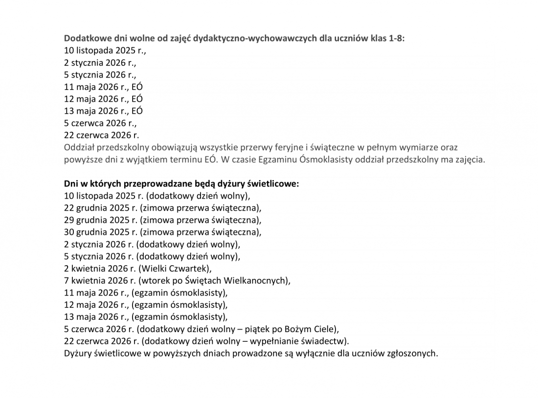 Uwaga: zestawienie dni, w czasie których organizowane są zajęcia opiekuńczo wychowawcze znajduje się pod tabelą.