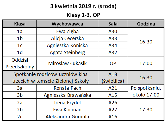 W dniach 3 oraz 4 kwietnia zapraszamy rodziców na spotkania z wychowawcami: