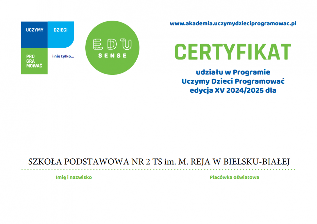 Z radością informujemy, że nasza szkoła wzięła udział w kolejnej – 15. edycji ogólnopolskiego programu „Uczymy dzieci programować”, organizowanego przez EduSense. To już kolejny raz, gdy nasi uczniowie aktywnie uczestniczyli w zajęciach rozwijających logiczne myślenie, kreatywność oraz kompetencje przyszłości.