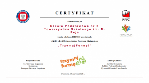 W roku szkolnym 2024/2025 Szkoła Podstawowa nr 2 wzięła udział w Ogólnopolskim Programie Edukacyjnym "Trzymaj formę".