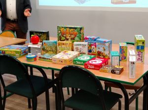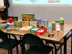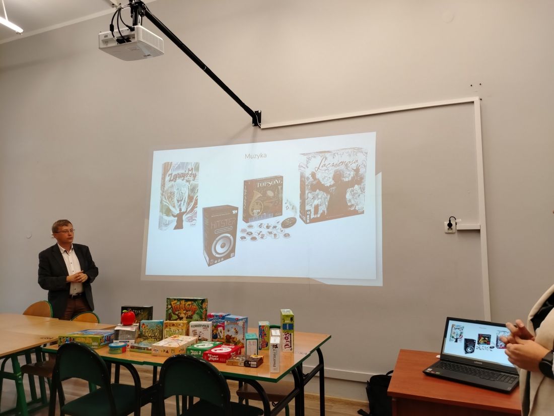 Po warsztatach dla uczniów nasi goście znaleźli czas także dla nauczycieli. Przeprowadzili szkolenie z wykorzystania gier planszowych w edukacji, omawiając korzyści płynące z zaangażowania takich narządzi oraz podali wiele przykładów dla wszystkich przedmiotów szkolnych. W części praktycznej szkolenia nauczyciele przećwiczyli zabawę z kilkoma grami wskazanymi dla ich przedmiotów.