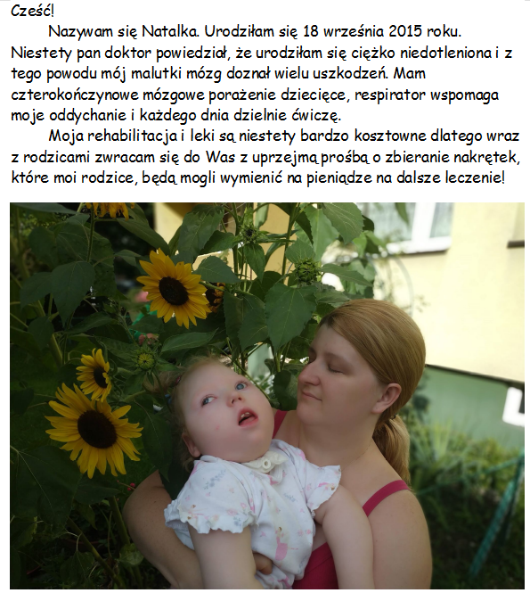 Plastikowe nakrętki są surowcem, który może komuś uratować życie. Tegoroczną zbiórkę nakrętek przeznaczamy na pomoc chorej Natalce. Nie wyrzucaj! Zbieraj!