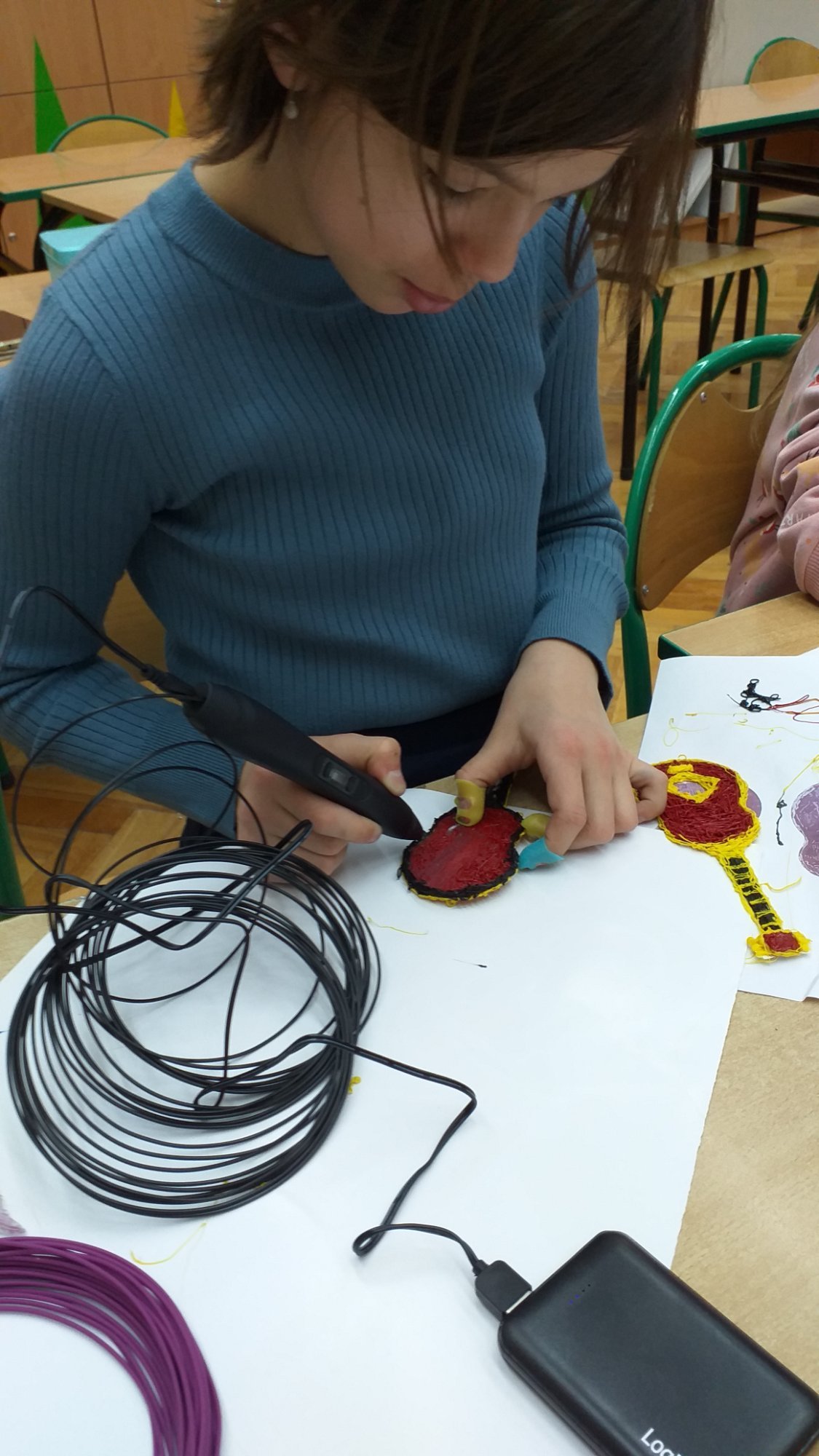 Uczniowie klas starszych na zajęciach koła plastycznego także podjęli naukę obsługiwania długopisów 3D i rozpoczęli kolorową, przestrzenną zabawę. Przydały się też kombinerki do przycinania filamentu zakupione w ramach programu.