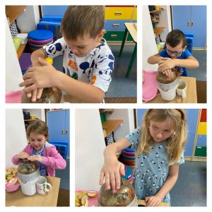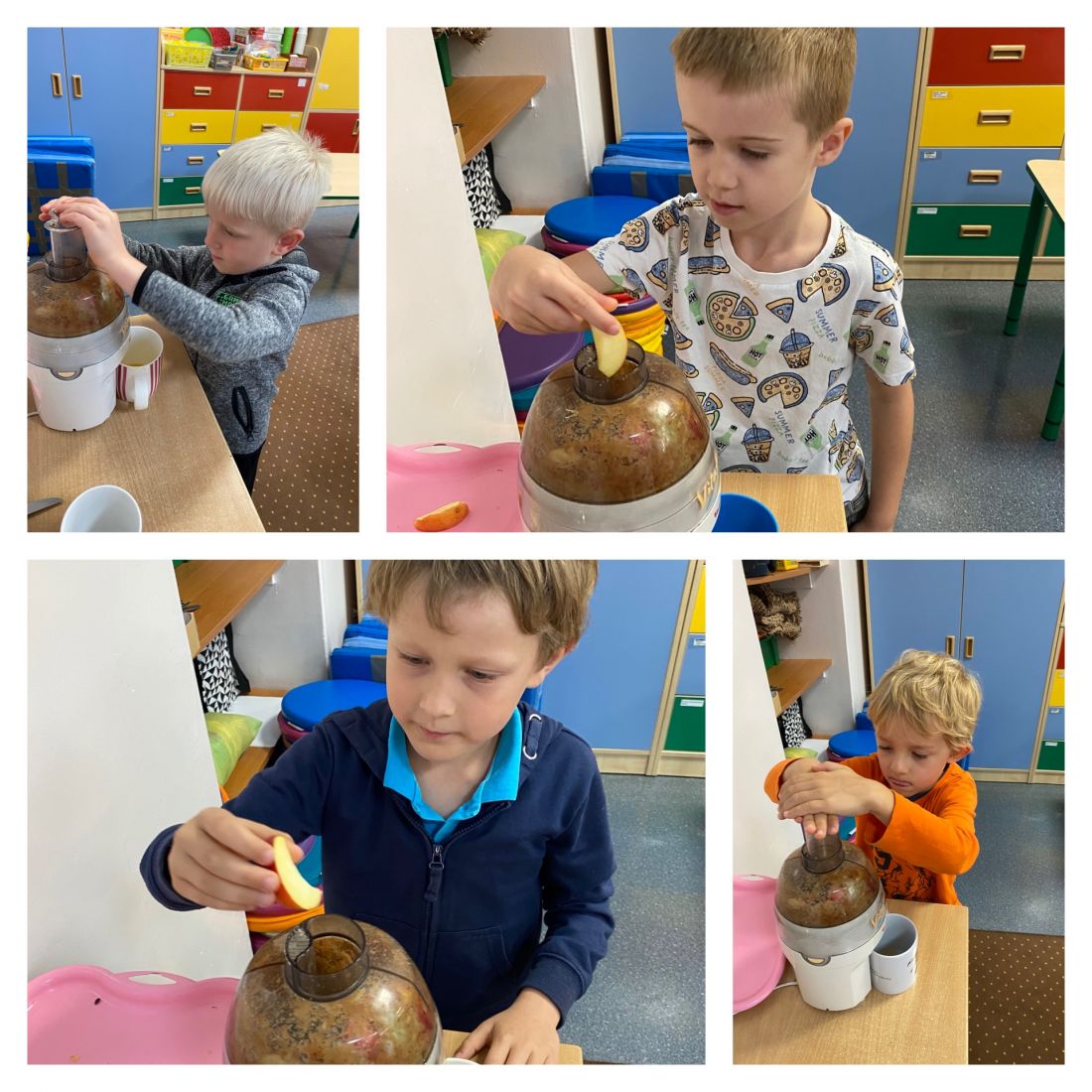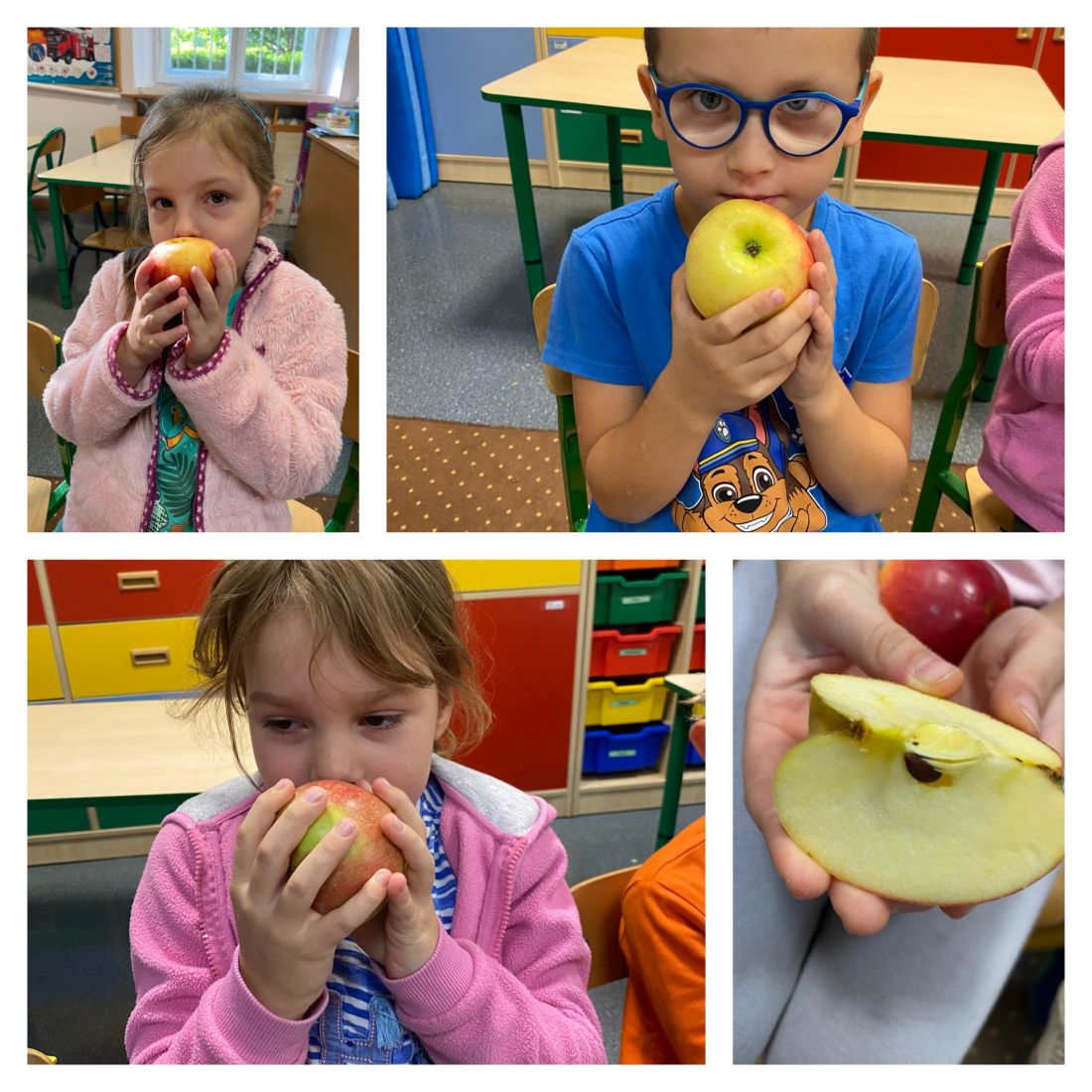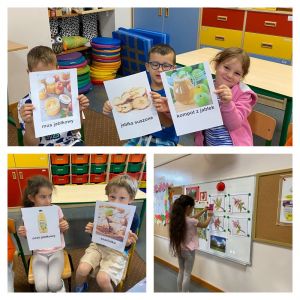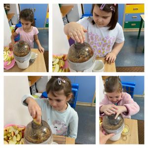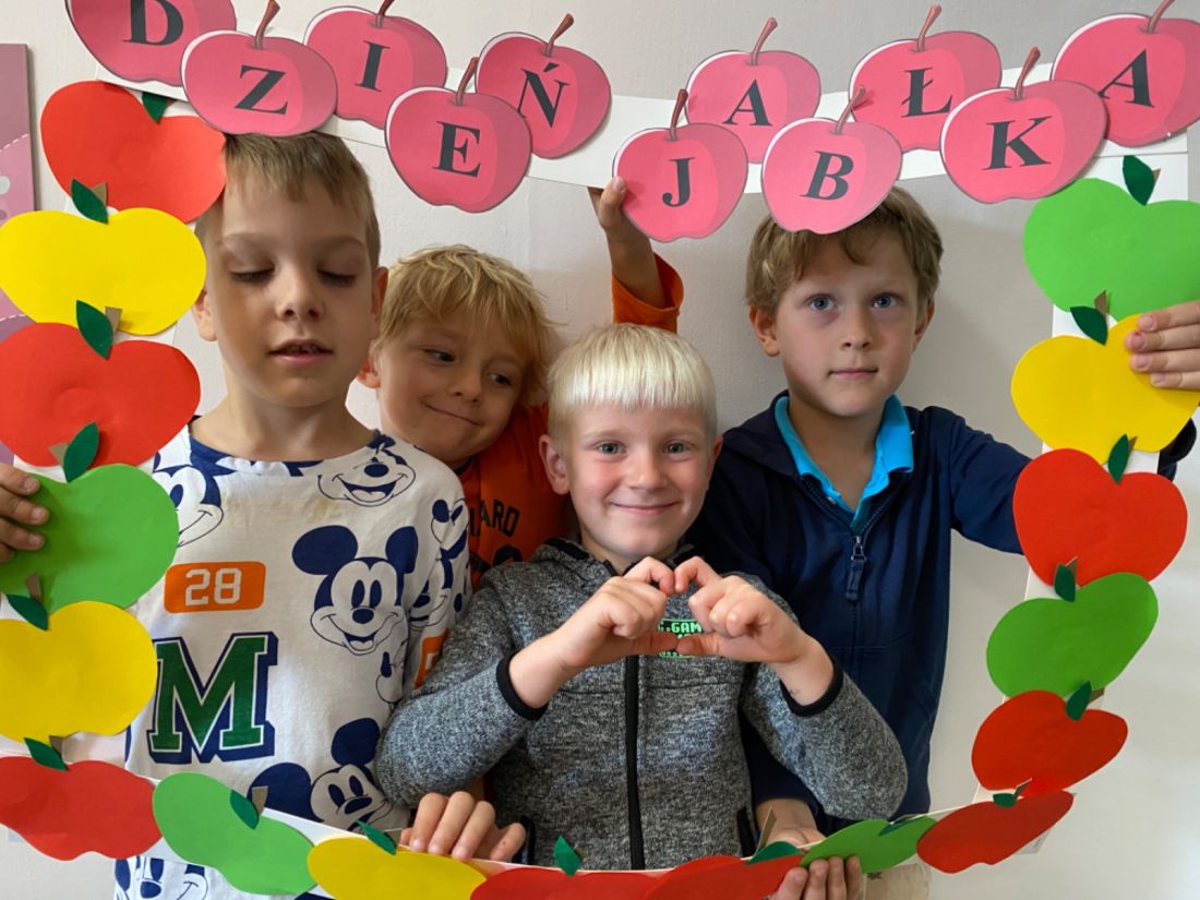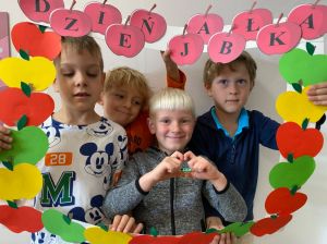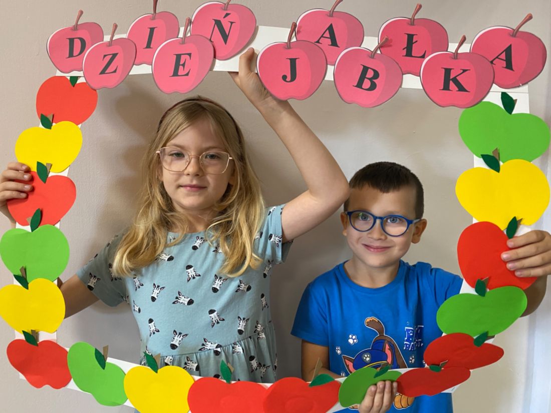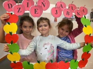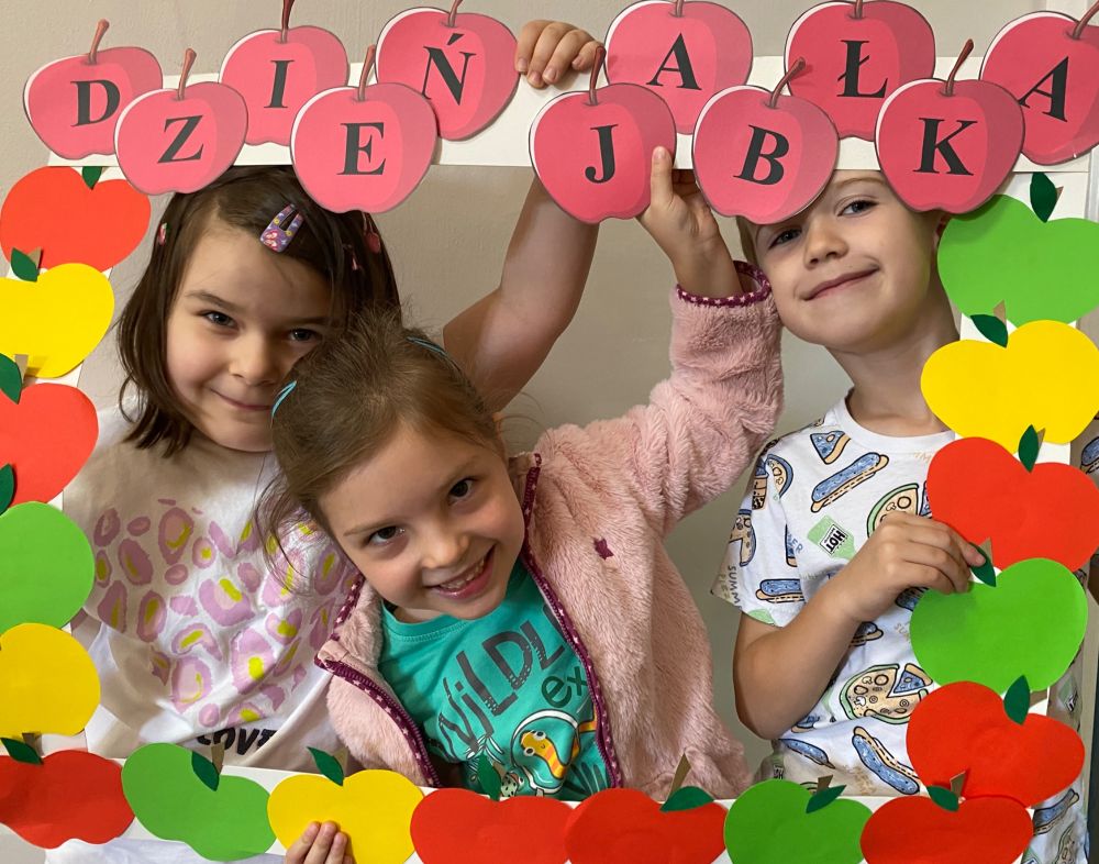 Na początku rozmawialiśmy na temat wyglądu tego owocu, kształtu, wielkości, kolorów. W zabawie dydaktycznej dzieci zobaczyły, z jakich części składa się jabłko, co znajduje się w środku niego. Historyjka obrazkowa dała dzieciom wiedzę na temat: “Skąd się biorą jabłka?”. Dzieci dzieliły się informacjami, co można zrobić z jabłek. Dowiedziały się również, jak bardzo ważne jest, aby jabłka jeść koniecznie ze skórką. Należy tylko pamiętać, aby przed spożyciem dokładnie je umyć. Nie mogło zabraknąć w tym dniu zajęć praktycznych, które związane były z przygotowaniem przez dzieci soku jabłkowego z wykorzystaniem sokowirówki, a następnie degustacją. Dzień zakończyliśmy pracą plastyczną - Jabłko w 3D.
