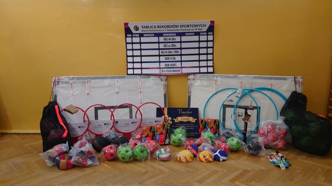 Po powrocie z wakacji miesiąc wrzesień nauczyciele wychowania fizycznego poświęcili między innymi na realizację nagrody od Pani Dyrektor i dokonania zakupów. Udało się zamówić: 2 tablice do koszykówki, 4 obręcze do koszykówki, rakiety do rzucania typu NERF, hula hopy, rożnego rodzaju piłki, pompki oraz igły, piłki lekarskie, worki do przechowywania piłek, rękawice bramkarskie oraz nową tablicę rekordów sportowych szkoły.