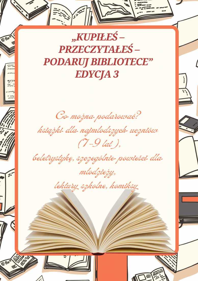 Z ogromną radością zapraszamy całą społeczność naszej szkoły do udziału w kolejnej odsłonie wyjątkowej akcji „Kupiłeś – Przeczytałeś – Podaruj Bibliotece”! To już trzecia edycja!