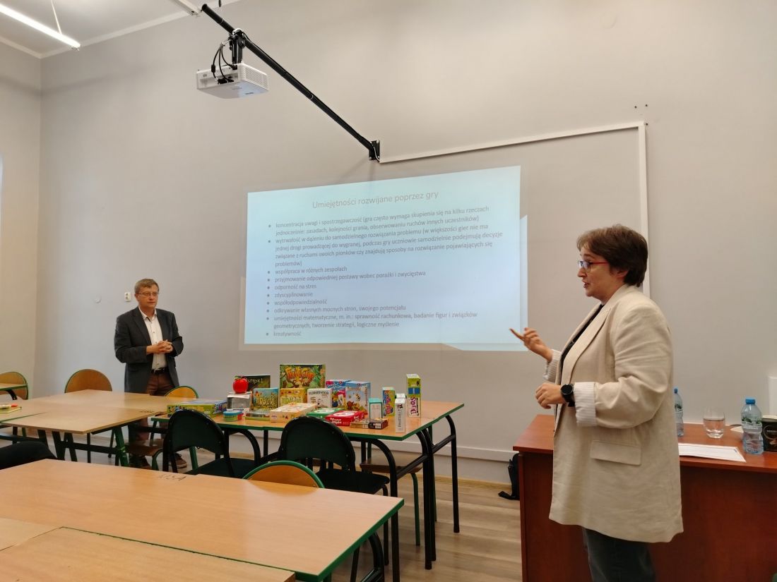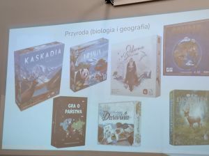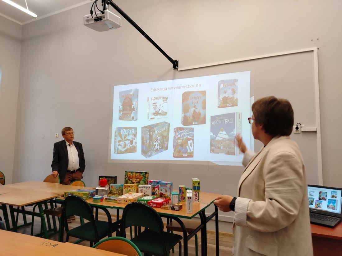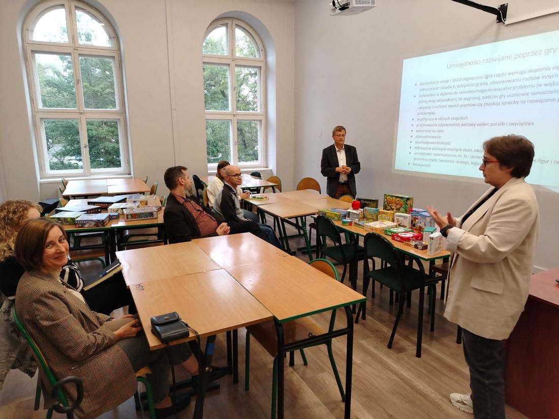 Po warsztatach dla uczniów nasi goście znaleźli czas także dla nauczycieli. Przeprowadzili szkolenie z wykorzystania gier planszowych w edukacji, omawiając korzyści płynące z zaangażowania takich narządzi oraz podali wiele przykładów dla wszystkich przedmiotów szkolnych. W części praktycznej szkolenia nauczyciele przećwiczyli zabawę z kilkoma grami wskazanymi dla ich przedmiotów.